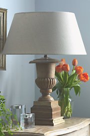Wooden Urn Table Lamp by Soft Surroundings - This beautifully carved, natural wood lamp in a rustic walnut finish features a graceful urn shape with architectural fluted details. Equally appealing from cottage to loft - whatever your home décor. Nickel-plated brass hardware. Natural linen, 29" diameter barrel shade. 26" total height with shade. UL listed. Each piece ships directly from the manufacturer. Please allow 1 to 2 weeks (if in stock) for delivery.